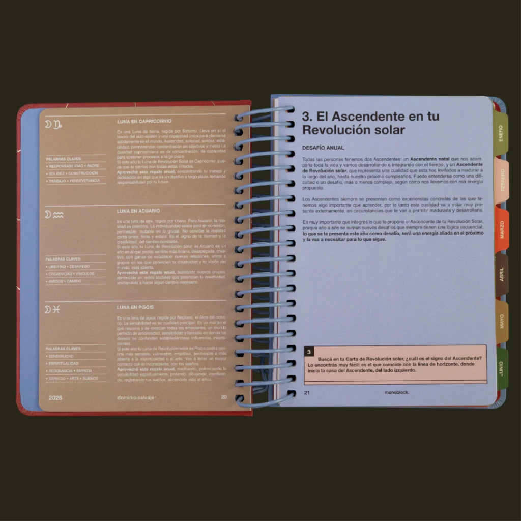 Creada junto a Nela Micoli —astróloga y autora de Tarot Salvaje—, Revo Solar es una agenda astrológica y un libro de autoconocimiento basado en la Revolución Solar: el momento en que, cada año, el Sol regresa al mismo lugar donde estaba el día que naciste, dando inicio a un nuevo ciclo personal. Te enseña a explorar tus cartas y a reconocer qué áreas de tu vida cobrarán protagonismo, con un acompañamiento mes a mes para registrar todos tus descubrimientos.