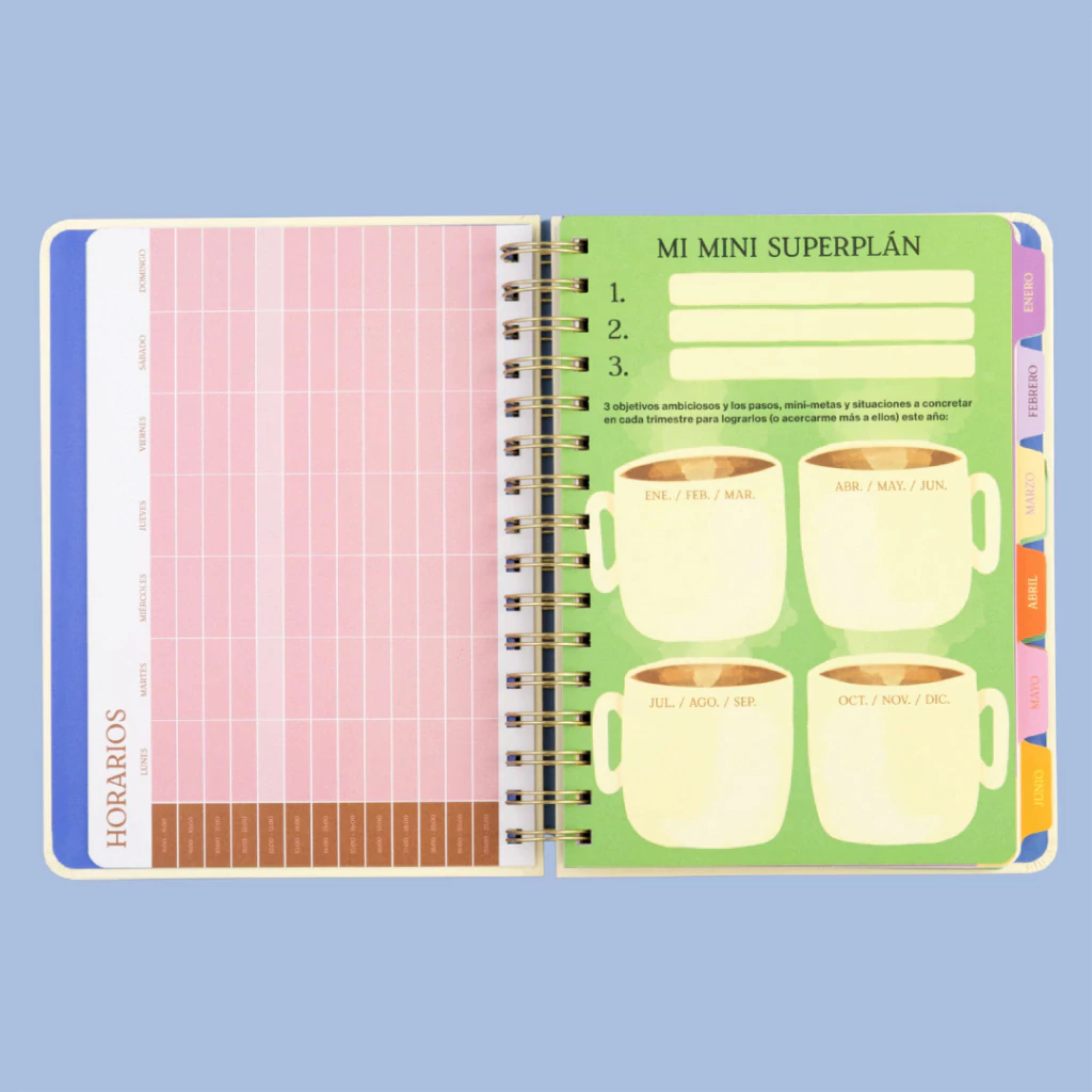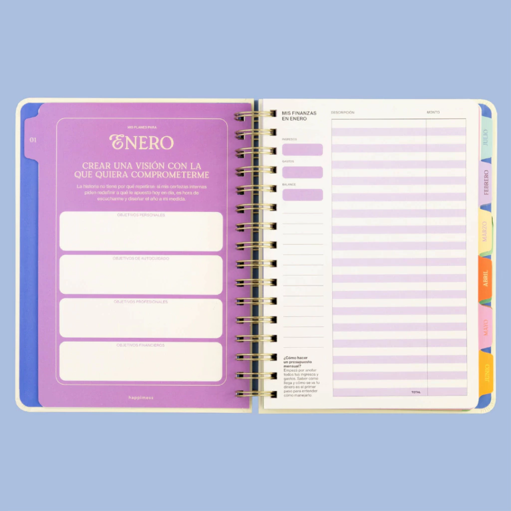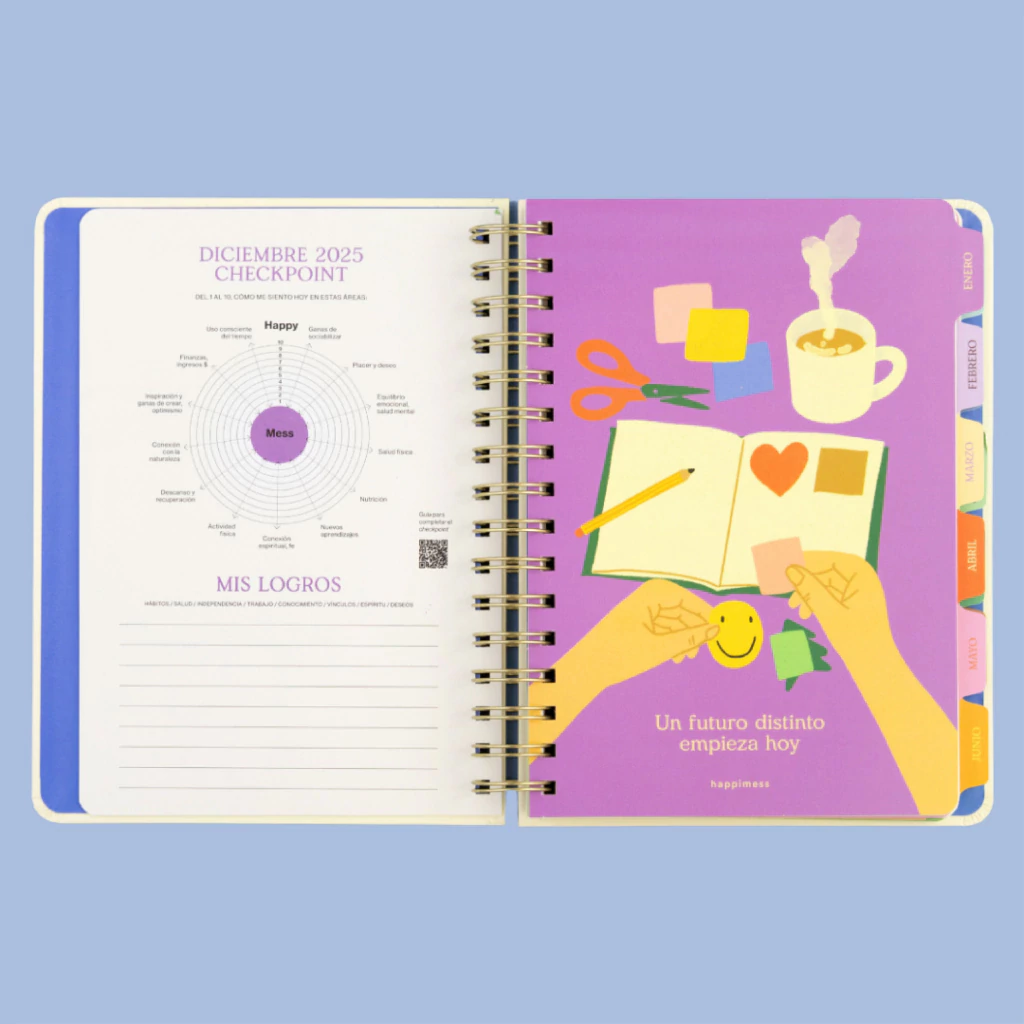 Esta agenda “arcoíris” —cada mes tiene un color, marcando el paso del tiempo— te propone una consigna mensual de autoconocimiento, frases inspiradoras y optimistas, y diversas secciones —trackers de hábitos, vision board, checkpoints, planificadores, etc.— pensadas para ayudarte a sostener lo que te hace bien y cuidar lo más valioso: tu foco y tu energía.