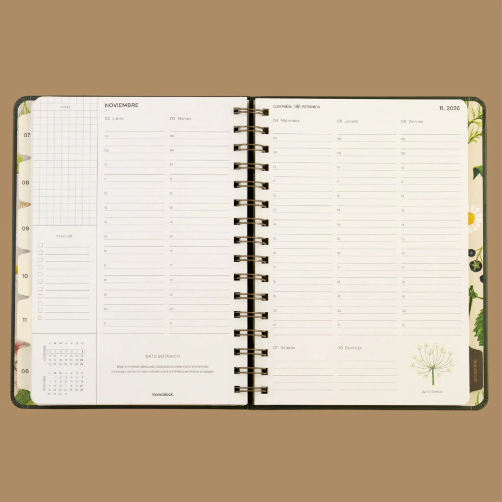 Su interior semanal es elegante y atemporal, con un diseño de columnas en vertical y horarios. Cada semana incluye espacio para listar tareas, escribir notas y disfrutar de un ritual botánico en sintonía con los proyectos de cada mes. Las delicadas ilustraciones naturalistas de @amparomartinet acompañan su diseño minimalista y delicado