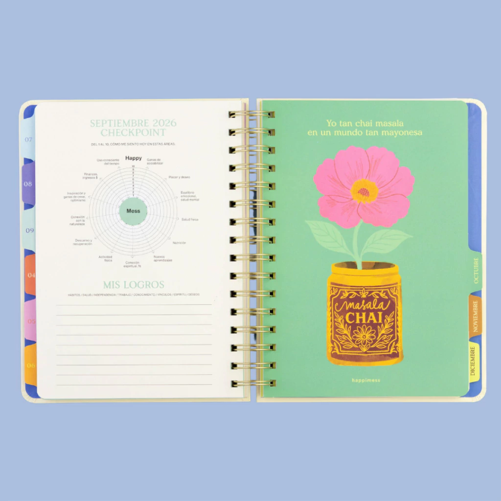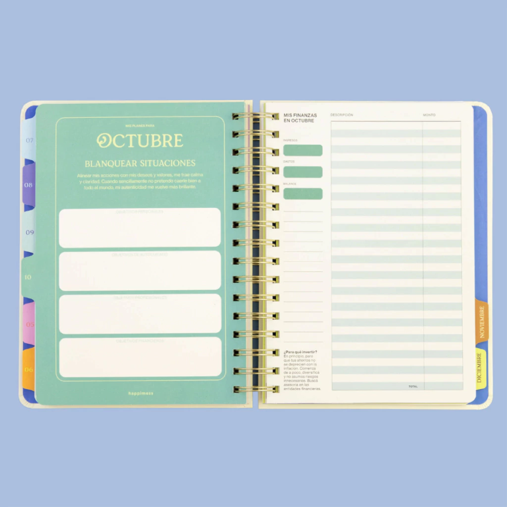 Esta agenda “arcoíris” —cada mes tiene un color, marcando el paso del tiempo— te propone una consigna mensual de autoconocimiento, frases inspiradoras y optimistas, y diversas secciones —trackers de hábitos, vision board, checkpoints, planificadores, etc.— pensadas para ayudarte a sostener lo que te hace bien y cuidar lo más valioso: tu foco y tu energía.